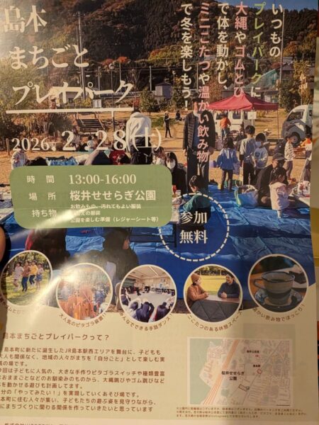 【島本まちごとプレイパーク】参加(^^♪ 公演日2026-02-28 会場島本町「桜井せせらぎ公園」(map) URL- 価格- 《島本まちごとプレイパーク》参加無料 (日時)2026年2月28日㈯ 13時~16時 (場所)島本町「桜井せせらぎ公園」 (出演)14時30分 石田くみ子:手話の表現ダンス 中村裕美子:ピアノ弾き歌い 中村裕美子の演奏でイシダの手話の表現ダンスでお楽しみ下さい。 山崎保育園の父母の会から芽生え、島本で息づいた劇団「あるくおもちゃ箱」が、 今回 石田くみ子で 初めての参加にドキドキワクワクしています。 老若男女皆さんが楽しんで頂けるイベントです。 寒さ吹き飛ばす楽しさ感じにお越し下さい。