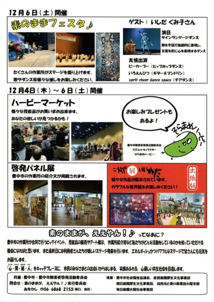 豊中市の作業所が合同で行うビックイベント。授産品の販売やアート展示、作業所紹介等など私たちがどんな活動をしているのかを知っていただける機会になればと思います。また最終日には利用者さんたちが楽しいステージ発表を行います。エネルギッシュかつパワフルなステージで皆さんにも元気をお届けします。 「心・開・結・人」をキャッチフレーズに、市民のみなさまとの出会いからはじまる、笑顔あふれる、心優しい共生社会を目指します。