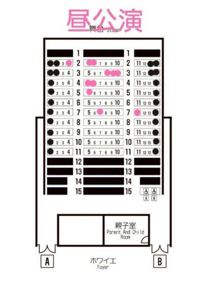 石田くみ子 ひとり語り芝居「碧き魂~繋げる命~」 最新座席表です!!(2025年12月2日現在)お席は先着順です。色がついています席はご予約済です。白のお席よりお選び下さい。チケットご購入の場合は、公演日・公演名・昼か夜のどちらか・枚数・ご希望のお席の列と番号の第1~第3希望、お名前・ご住所・メールアドレス・お電話番号をご記入の上こちらのメールアドレスへお申込みください。→ kumiko.ishida@i-love-soul.com